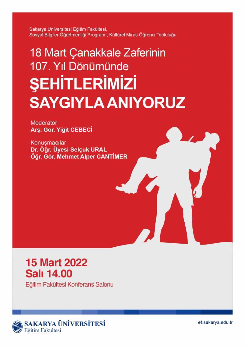 Sosyal Bilgiler Öğretmenliği Programı öncülüğünde kurulan Kültürel Miras Topluluğu tarafından 18 Mart Çanakkale Zaferi ve Şehitleri Anma Günü etkinliği organize edilmiştir. 15 Mart 2022 Salı Günü saat 14.00'te SAÜ Eğitim Fakültesi Konferans Salonunda gerçekleştirilen etkinlikte Dr.Öğr.Üyesi Selçuk URAL ve Öğr.Gör. Mehmet Alper CANTİMER tarafından "Tarihi Yönleriyle Çanakkale ve Cephede Yaşananlar" içerikli konuşmalar gerçekleştirilip şehitlerimiz saygıyla anılmıştır. Ayrıca Eğitim Fakültesi bahçesinde Hendek Belediyesi tarafından tüm öğrencilerimize çorba ve çay ikramı yapılmıştır.