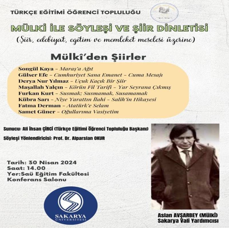 Fakültemiz Türkçe Eğitimi Öğrenci Topluluğu tarafından düzenlenen “Mülki ile Söyleşi ve Şiir Dinletisi” etkinliğine katılan Sakarya Vali Yardımcısı Sayın Aslan Avşarbey katılımcılara şiir, edebiyat, eğitim ve memleket meseleleri üzerine konuşmalarda bulundu. Öğretim Üyemiz Sayın Prof. Dr. Alparslan OKUR’un yönlendirici olduğu etkinlikte topluluk öğrencileri katılımcılara birbirinden güzel şiirlerden oluşan bir dinleti sundular. Fakültemiz Dekanı Sayın Prof. Dr. Hüseyin ÇALIŞKAN’ın etkinliğimize teşrif eden Saygıdeğer Vali Yardımcısı Aslan Avşarbey’e plaket takdimi ve görevli öğrencilere teşekkür belgesi verilmesinin ardından etkinlik sona erdi.
