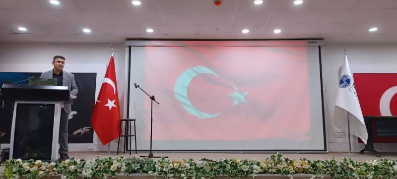 Dekan Yardımcısı Doç. Dr. Dursun Aksu konuşmasında “ Cumhuriyetin bize sağladığı en büyük imkanlardan biri herkese eşit eğitim hakkı sunmasıdır. Bu eşitlik ortamında yetişen her bir öğrenci bilgiyle donanarak topluma fayda sağlama, ulusal değerleri sahiplenme ve vatanı yüceltme fırsatını bulur. Öğretmenlik mesleği bu değerlerin gelecek kuşaklara aktarılmasında anahtar bir rol oynar. Bu anlamlı günde başta Gazi Mustafa Kemal Atatürk olmak üzere Cumhuriyeti bizlere kazandıran tüm kahramanlarımızı saygı minnet ve rahmet anıyoruz. Cumhuriyetimizi ve ulusal değerlerimizi yaşatmak öğretmenlik mesleğinin onurlu yüküdür. Bu yükü gururla taşımak hepimizin görevidir. Cumhuriyet Bayramımız kutlu olsun.” ifadelerine yer verdi.