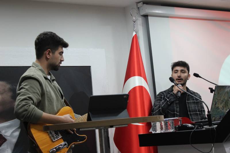 Konuşmaların ardından öğrencilerimizden Zeynep Efe “Cumhuriyet” konulu konuşmasını gerçekleştirdi. Ardından Bayrak şiirini seslendirmek üzere öğrencilerimizden Maşallah Yalçın kürsüye geldi. Öğrencilerimizden Esma Çelikkol kemanı ile, İbrahim Halil İnakçı ve Arda Özdemir ise elektrogitar ile birbirinden güzel eserlere can verdiler. Katılımcıların hep bir ağızdan eşlik ettiği marşların ardından tören sonlandırıldı ve Fakülte bahçesinde Bayrak Yürüyüşü yapıldı.