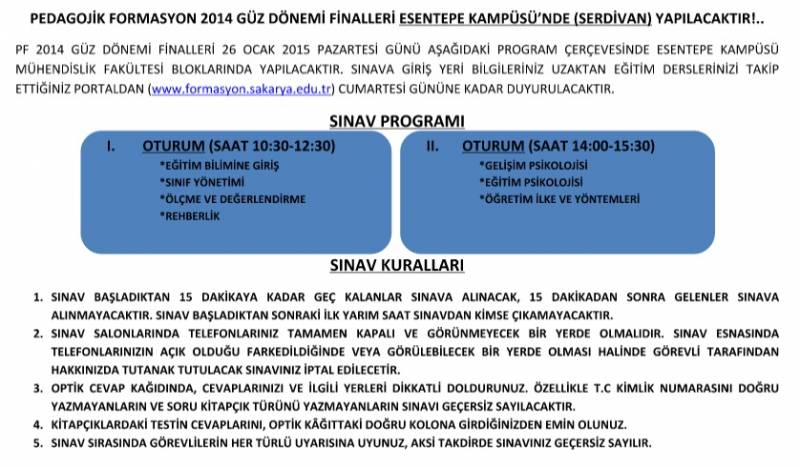 PF 2014 GÜZ DÖNEMİ FİNALLERİ 26 OCAK 2015 PAZARTESİ GÜNÜ YUKARIDAKİ PROGRAM ÇERÇEVESİNDE ESENTEPE KAMPÜSÜ MÜHENDİSLİK FAKÜLTESİ BLOKLARINDA YAPILACAKTIR. SINAVA GİRİŞ YERİ BİLGİLERİNİZ UZAKTAN EĞİTİM DERSLERİNİZİ TAKİP ETTİĞİNİZ PORTALDAN http://www.formasyon.sakarya.edu.tr CUMARTESİ GÜNÜNE KADAR DUYURULACAKTIR.
