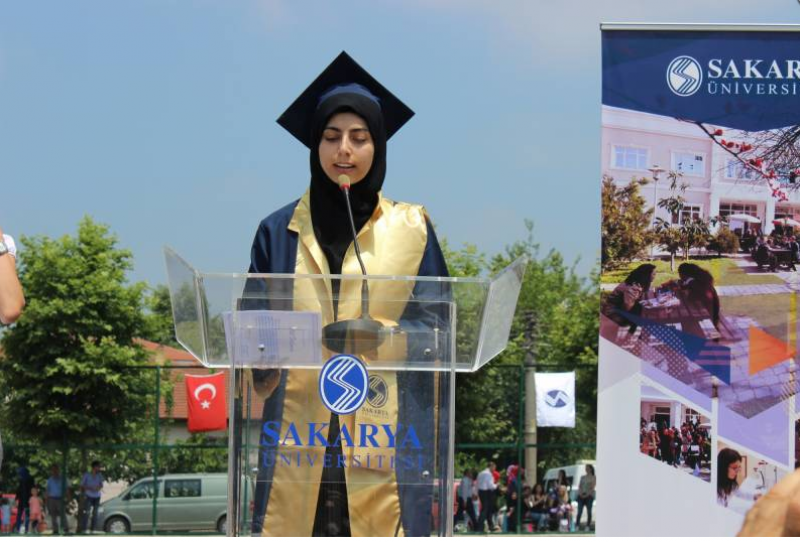Bugün burada Türkiye ve dünyada kalite ödülü almış; Urap sıralamasında 2014'te Türkiye üçüncüsü, 2015'te Türkiye ikincisi olan bir fakülteden mezun olmanın gururunu yaşıyorum. Geçen sene olduğu gibi bu sene de fakülte birincisi bizim bölümümüzden, yani Bilgisayar ve Öğretim Teknolojileri Öğretmenliği Bölümü'nden çıktı. Bu onuru taşımanın gururu içerisindeyim. Elbette ki bu birinciliğin tek muhatabı ben değilim. Başta her türlü maddi ve manevi desteği esirgemeyen, her daim yanımda olan, varlıklarından tarif edilemeyecek mutluluk ve güven duyduğum aileme; saygıdeğer hocalarıma ve Sakarya Üniversitesi ailesine sonsuz teşekkürlerimi sunuyorum.
