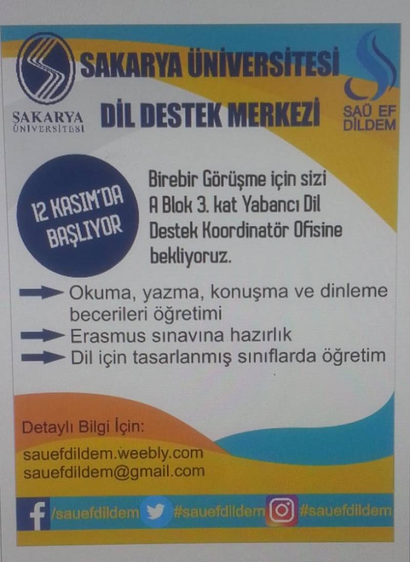 Erasmus sınavına girecek olan öğrenciler, İngilizce'yi günlük dil olarak kullanmayı planlayanlar, B1 seviyesine gelmek isteyen öğrenciler ve bölümlerde alınan İngilizce dersine destek duyanlar Dil Destek Ofisine katılabilirler. Posterde yer alan web sayfalarını kontrol ederek başvuru formu için linki bulabilirler ve ders programını görebilirler.