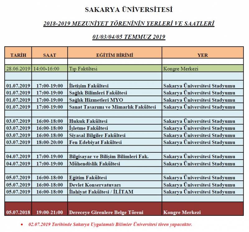 Sakara Üniversitesi Eğitim Fakültesi 2018-2019 Mezuniyet Töreni 05.07.2019 tarihinde 16:00-18:00 saatleri arasında Sakarya Üniversitesi Stadyumu'nda gerçekleştirilecektir. Tüm mezun olacak olan öğrencilerimize duyurulur.