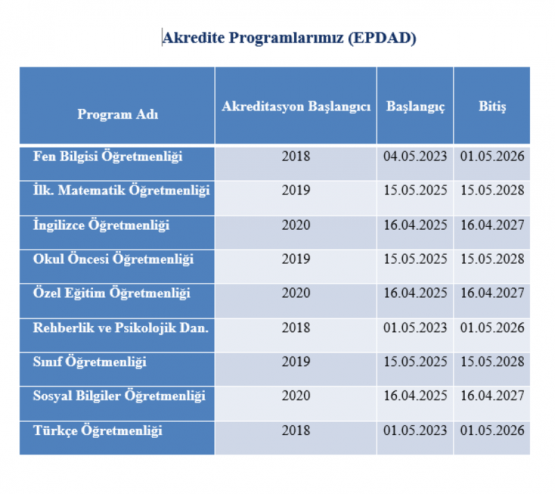 Böylelikle EPDAD (Öğretmenlik Eğitim Programları Değerlendirme ve Akreditasyon Derneği) tarafından yapılan inceleme ve değerlendirmeler sonunda Fakültemizde bulunan 9 Programımız akredite edilmiştir.